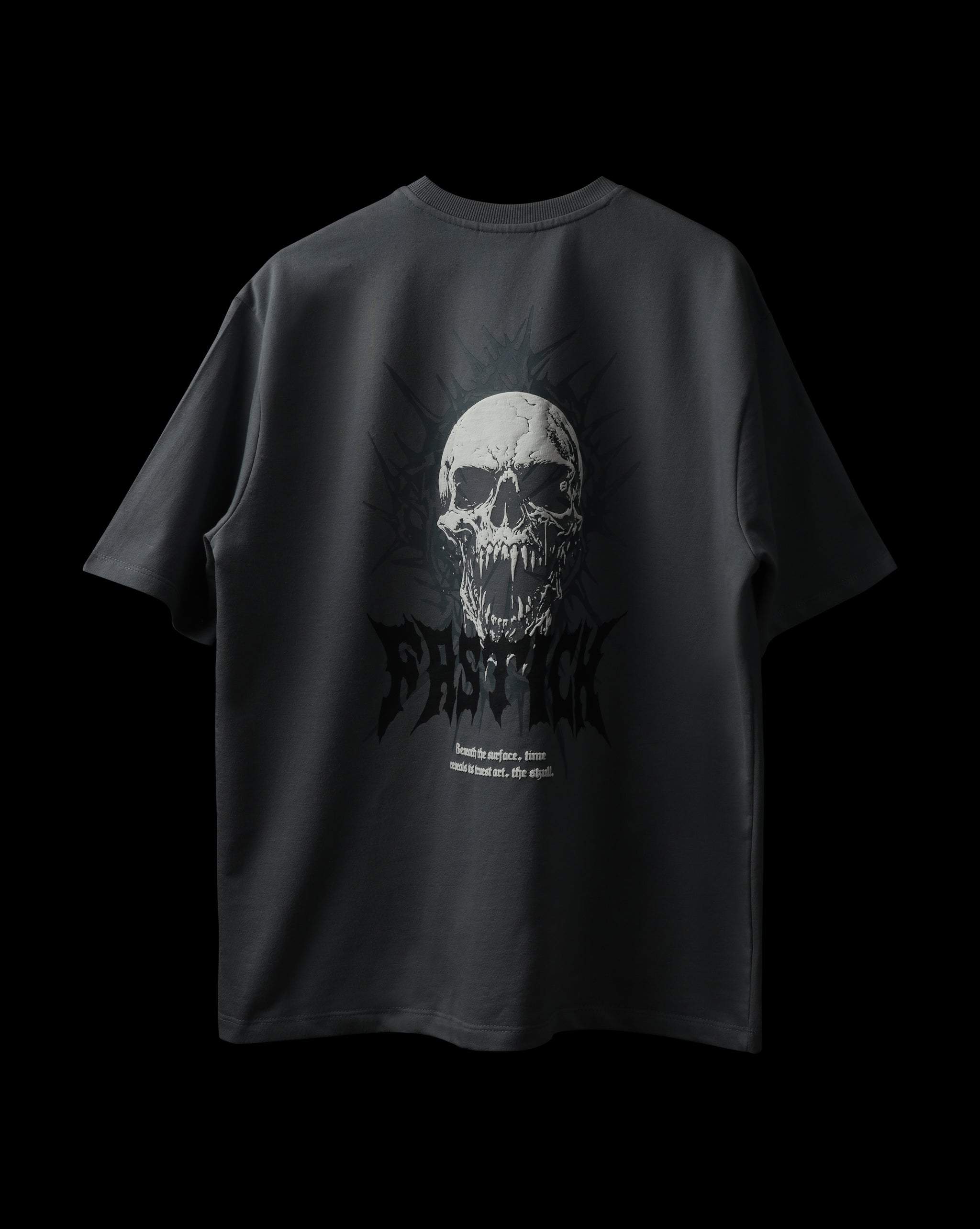 Grey Oversized T shirt Crafted from premium cotton, it brings a structured silhouette with a smooth, high-quality feel. The front carries subtle FASTICH branding, while the back reveals a bold skull artwork with hidden logo and paired with the line “Beneath the surface, time reveals the truest art ,the skull.”