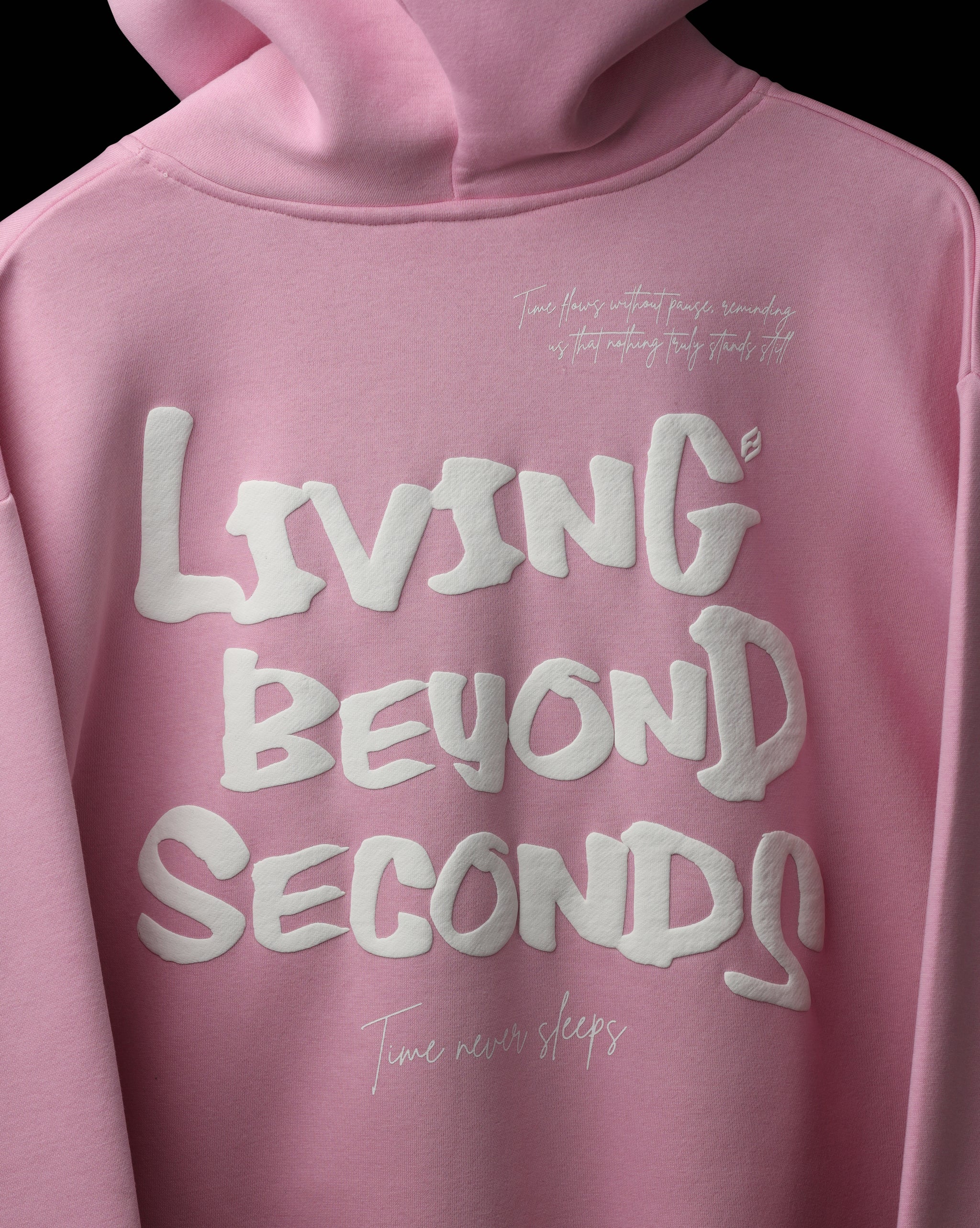 The back showcases white puff print text that reads “Living Beyond Seconds,” followed by the line “time flows without pause, reminding that nothing truly stands still,” and finishes with “Time Never Sleeps.” Every word captures the essence of motion and purpose.